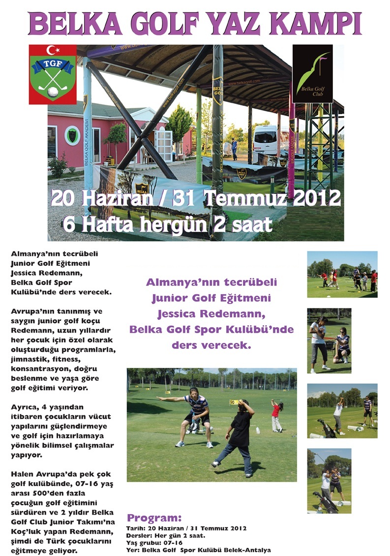Belek-Antalya, Belka Golf Spor Kulübü, golf sporunu çocuklar ve gençlerle buluşturma geleneğini sürdürüyor! 2012 yılında Almanya'nın deneyimli junior golf eğitmeni Jessica Redemann'ın liderliğinde düzenlenen ve büyük ilgi gören 6 haftalık yoğun yaz kampının heyecanını, günümüz koşullarına uyarlayarak yeniden canlandırıyoruz. Belka Golf, 2012 yazı için çocuklar ve gençlere özel, modern ve kapsamlı golf eğitim programlarını heyecanla duyuruyor.