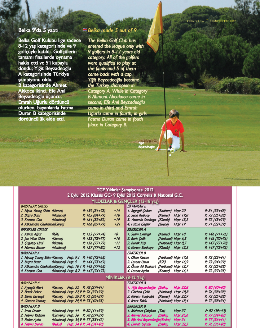 Türkiye Golf Federasyonu (TGF) tarafından düzenlenen 2012 Yıldızlar Şampiyonası'nda (Minikler kategorisi – 8-12 yaş) Belka Golf Kulübü büyük bir başarıya imza attı.