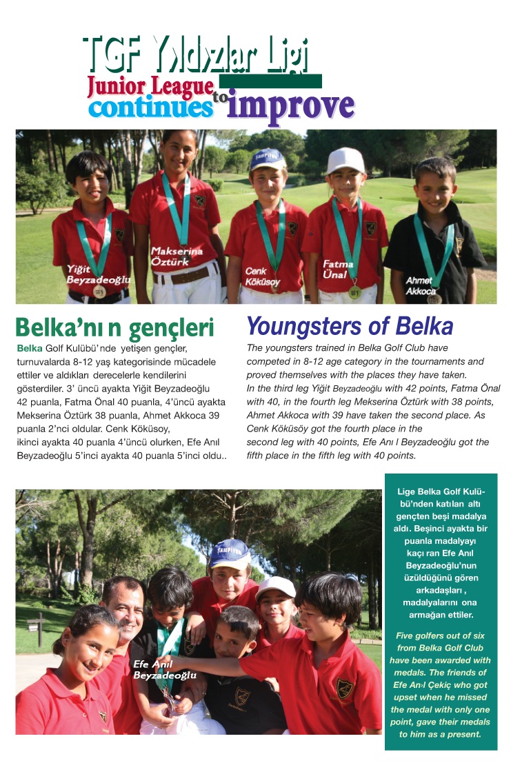 Antalya Belek'te faaliyet gösteren Belka Golf Kulübü'nde yetişen 8-12 yaş kategorisindeki genç golfçüler, Türkiye Golf Federasyonu'nun (TGF) Yerel Yıldızlar Turu ve benzeri Antalya Bölgesi ayak turnuvalarında üstün performans sergileyerek kulübe gurur yaşattı. Kulüpten lige katılan altı genç golfçüden beşi madalya kazanırken, özellikle bir ayakta yaşanan duygusal an herkesin takdirini topladı.