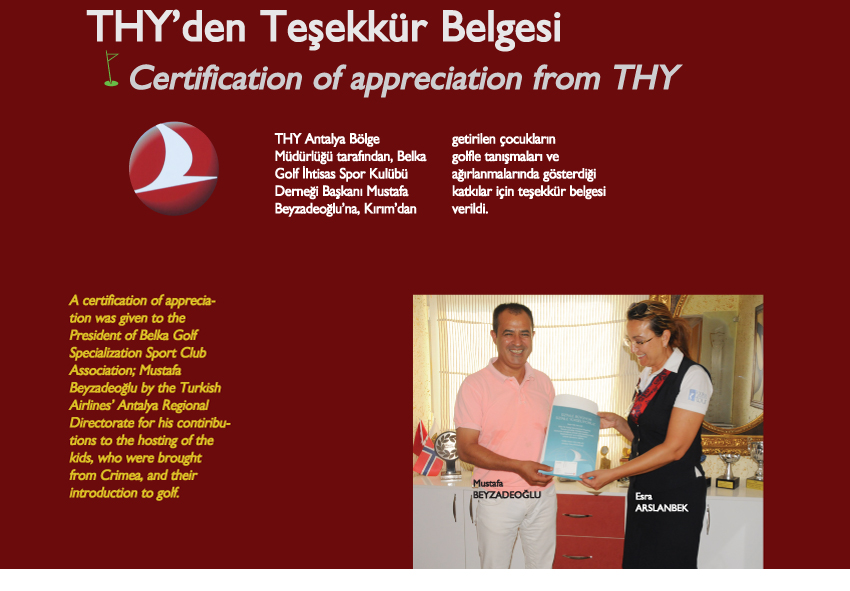 Antalya – Belek – Türk Hava Yolları (THY) Antalya Bölge Müdürlüğü, Kırım'dan getirilen çocuklara golf sporuyla tanışma ve ağırlama imkânı sağlanmasında gösterdiği değerli katkılar nedeniyle Belka Golf İhtisas Spor Kulübü Derneği Başkanı Mustafa Beyzadeoğlu'na Teşekkür Belgesi takdim etti.