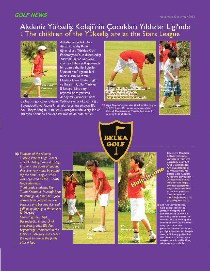Özellikle Efe Anıl Beyzadeoğlu, geçen yıl Minikler B Kategorisi'nde Türkiye üçüncüsü olduğu performansının üzerine bu yıl Antalya'daki final turnuvasında (National Golf Kulübü Akademi Sahası, 3. çukur) hole-in-one yaparak tarihe geçti! Henüz 10 yaşındayken her golfçünün hayatı boyunca belki bir kez yaşayabileceği bu eşsiz başarıyı elde eden Efe, okul ve ailemizin büyük gururu oldu.